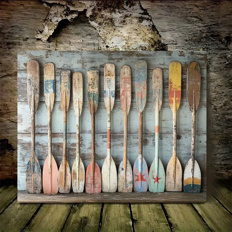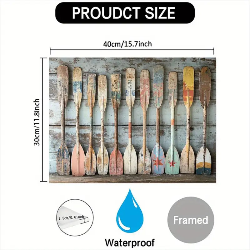 Create a nautical atmosphere in your home with our 2D Flat Retro Paddle Canvas Art. At 11.8 x 15.7 inches, this hand-painted canvas is the perfect size to display in your living room. The wooden frame adds a rustic touch, while the weathered wooden stand adds a coastal feel. You'll love how this piece adds a unique and stylish touch to your room. Add it to your collection of coastal or beach-themed home decor for the perfect finishing touch.