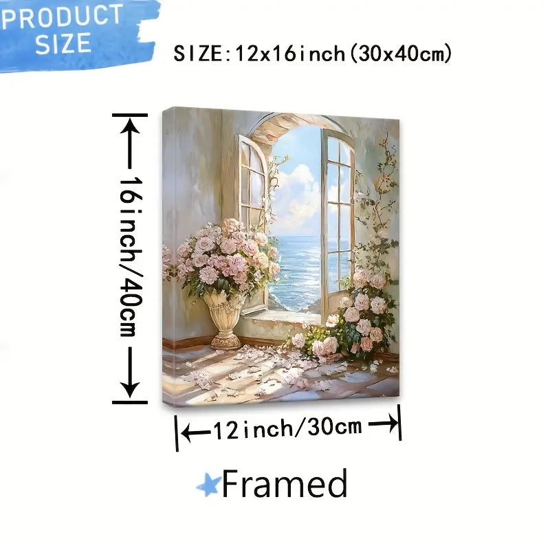 Enhance the atmosphere and charm of any space with this exquisite hand-painted canvas wall art. Made with high-quality materials and featuring a romantic seaside scene with pink roses and a breathtaking ocean view, this 12x16 inch piece is perfect for adding a touch of elegance and beauty to your living room, bedroom, or studio. The wrap wood frame adds a touch of natural warmth and the overall design is ideal for home decoration. Share the gift of beauty and relaxation with a loved one this holiday season, or treat yourself to a stunning piece of wall decor that will transport you to a scenic beach every time you look at it.