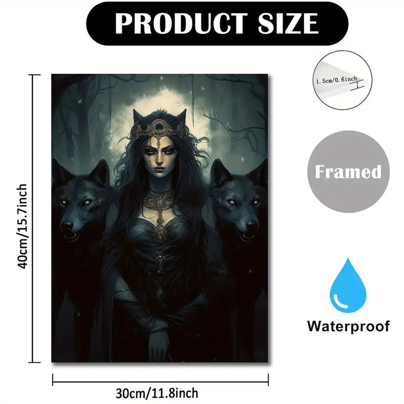 Elevate your space with this 11.8x15.7 inch canvas art featuring a striking depiction of Hecate and Medusa, iconic figures from Greek mythology. The artwork showcases a detailed witch and crow motif, expertly rendered in an oil painting style that adds depth and character. Mounted on a sturdy wooden inner frame and wrapped in a complementary wooden outer frame, this piece is designed for durability and aesthetic appeal. Ideal for home or office settings, it brings a sophisticated touch of mythological intrigue and artistic craftsmanship to your décor.